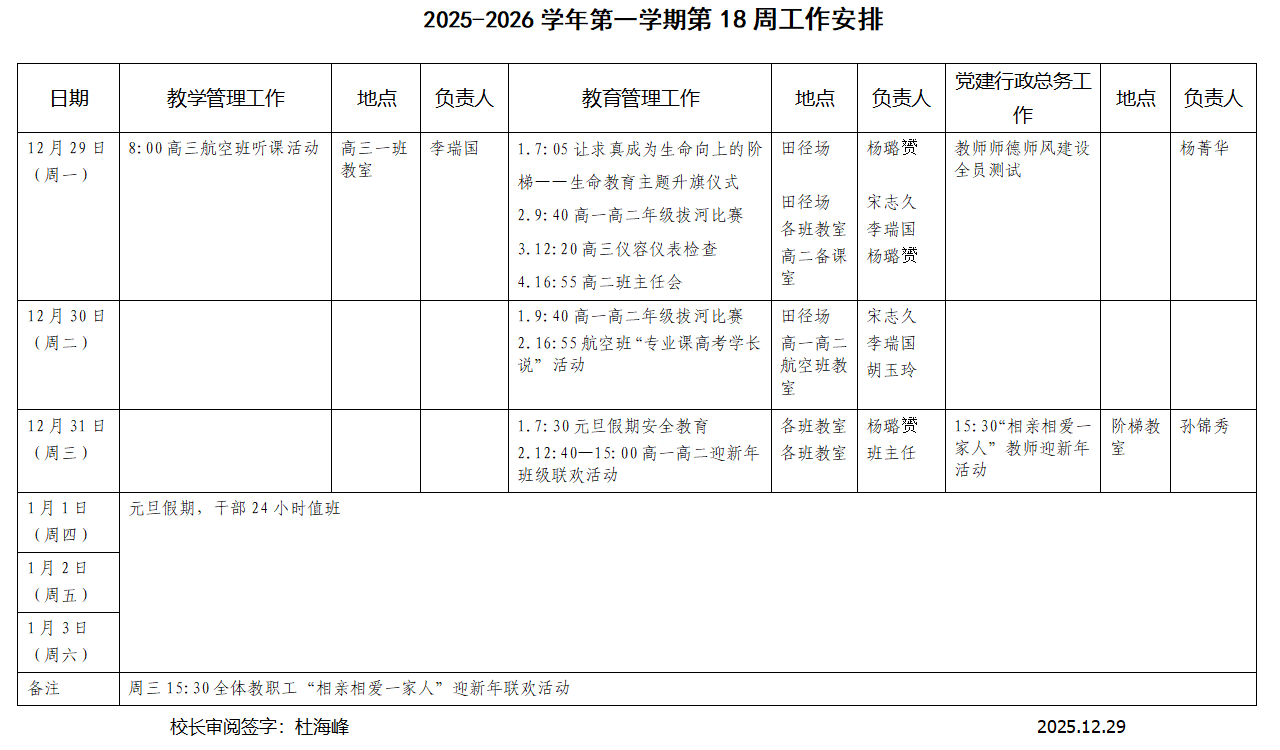 2025-2026学年第一学期第18周工作安排