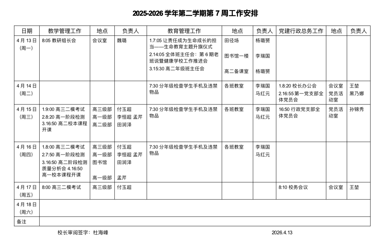 济南九中2025-2026学年第二学期第7周工作安排