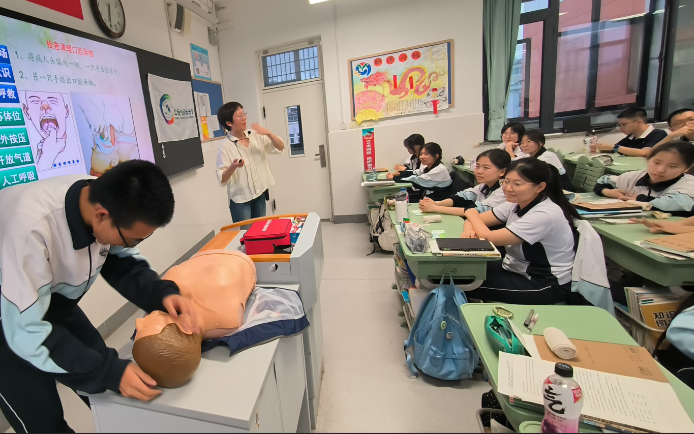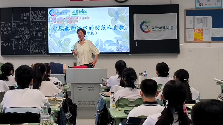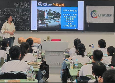 这次课程由九中教师邵雪娟和郑明明老师组织。邵老师结合近日来我国南方强对流天气和暴雨造成的灾害,向同学们详细讲解如何防范台风、暴雨、洪水灾害。针对台风洪水导致的外伤、触电等风险,带领同学进行了止血包扎、心肺复苏和体外除颤的实践操作。为学生提供必要的急救知识和技能,以便在气候变化导致的自然灾害发生时,学生们能够迅速有效地为自己和亲友提供有效援助。 接下来,郑明明老师从地理高考考点的角度,分析了全球气候变化、极端天气频发和气候变暖的概念。邵老师则指出:愈演愈烈的气候灾难正是来自人类对自然资源的掠夺和破坏。她介绍了世界各国为减碳进行的努力,并倡议同学们低碳生活,做拯救地球的行动者。