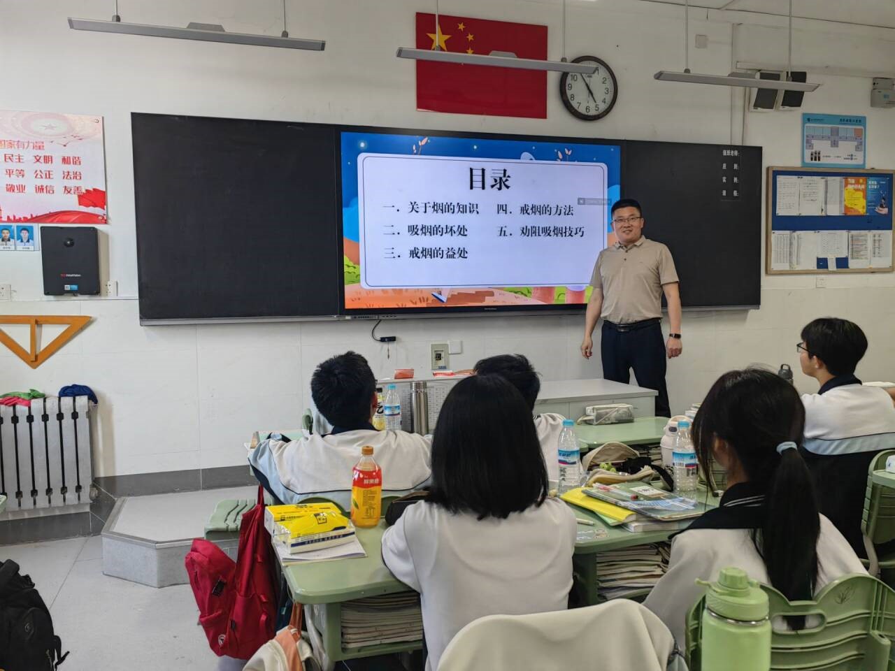 活动三:召开主题班会 在6月3日的班会上,济南九中的班主任们都召开了“无烟日”主题班会,给全班同学普及无烟日,更是强调了吸烟的危害,同时也号召全体同学从自身做起,拒绝吸烟,呼吁所有体同学都能尽自己最大的努力,劝阻身边的人吸烟。