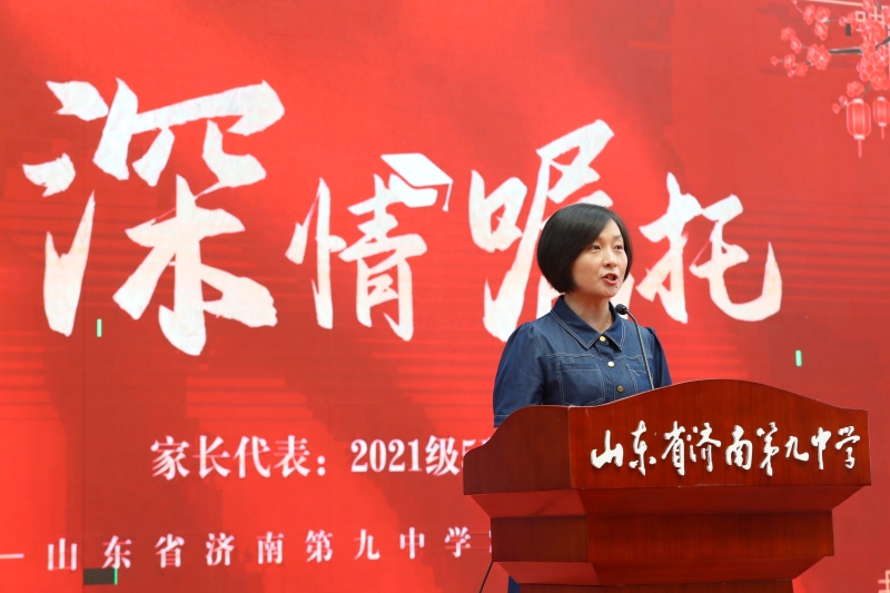 2021级家长代表李慧女士送上祝福和寄语。她代表全体家长高度认可学校各方面的工作,感谢济南九中老师们的尽心教导,回忆孩子们在九中三年的点点滴滴,并向即将奔赴高考考场的学生致以美好祝愿。