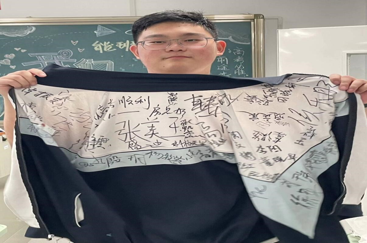 毕业在际,同学们也互相送上真诚的祝福,黄甲同学向镜头展示了他特别的校服外套,上面密密麻麻写满了同学们的名字,这是青春的美好回忆。