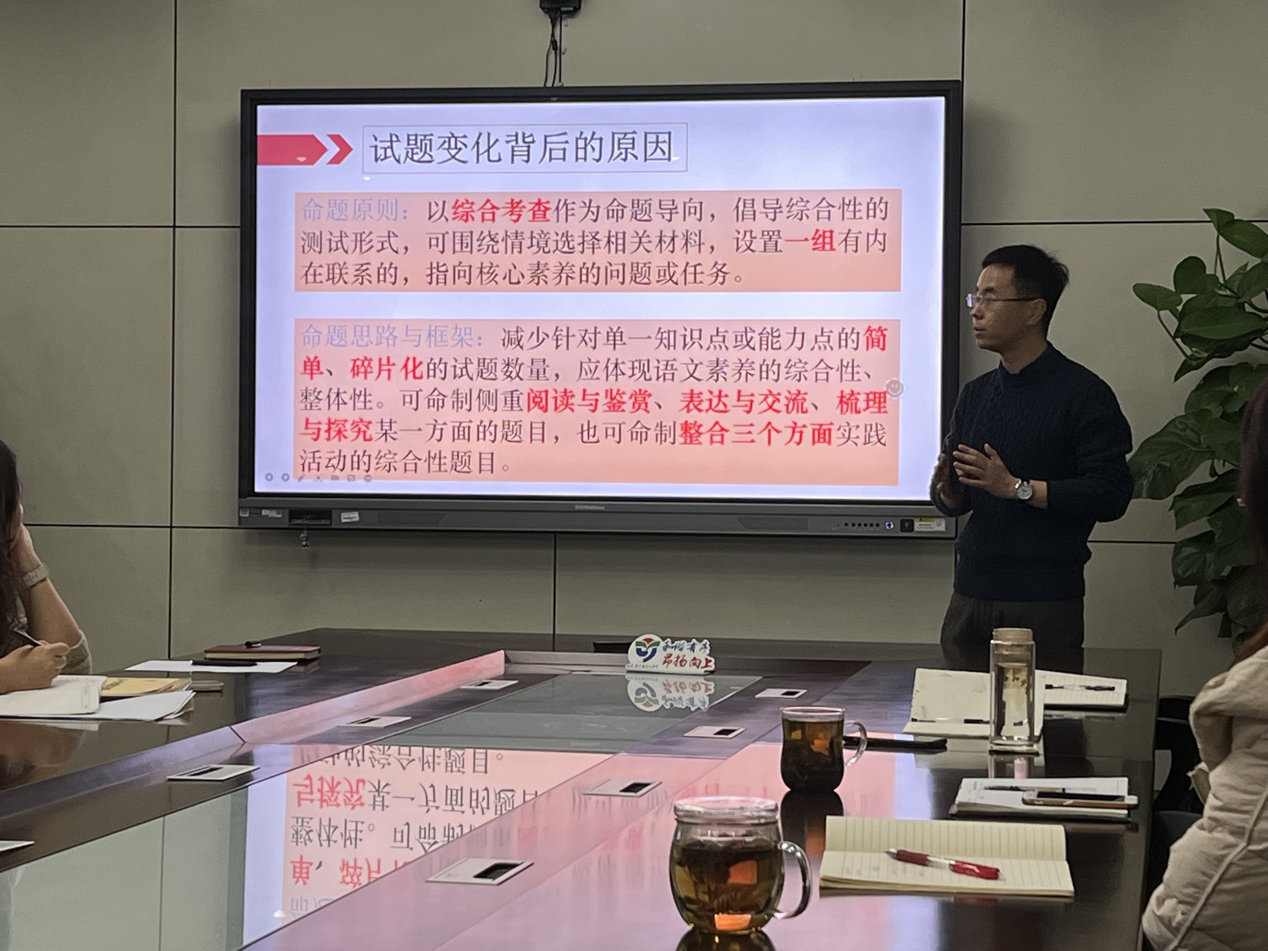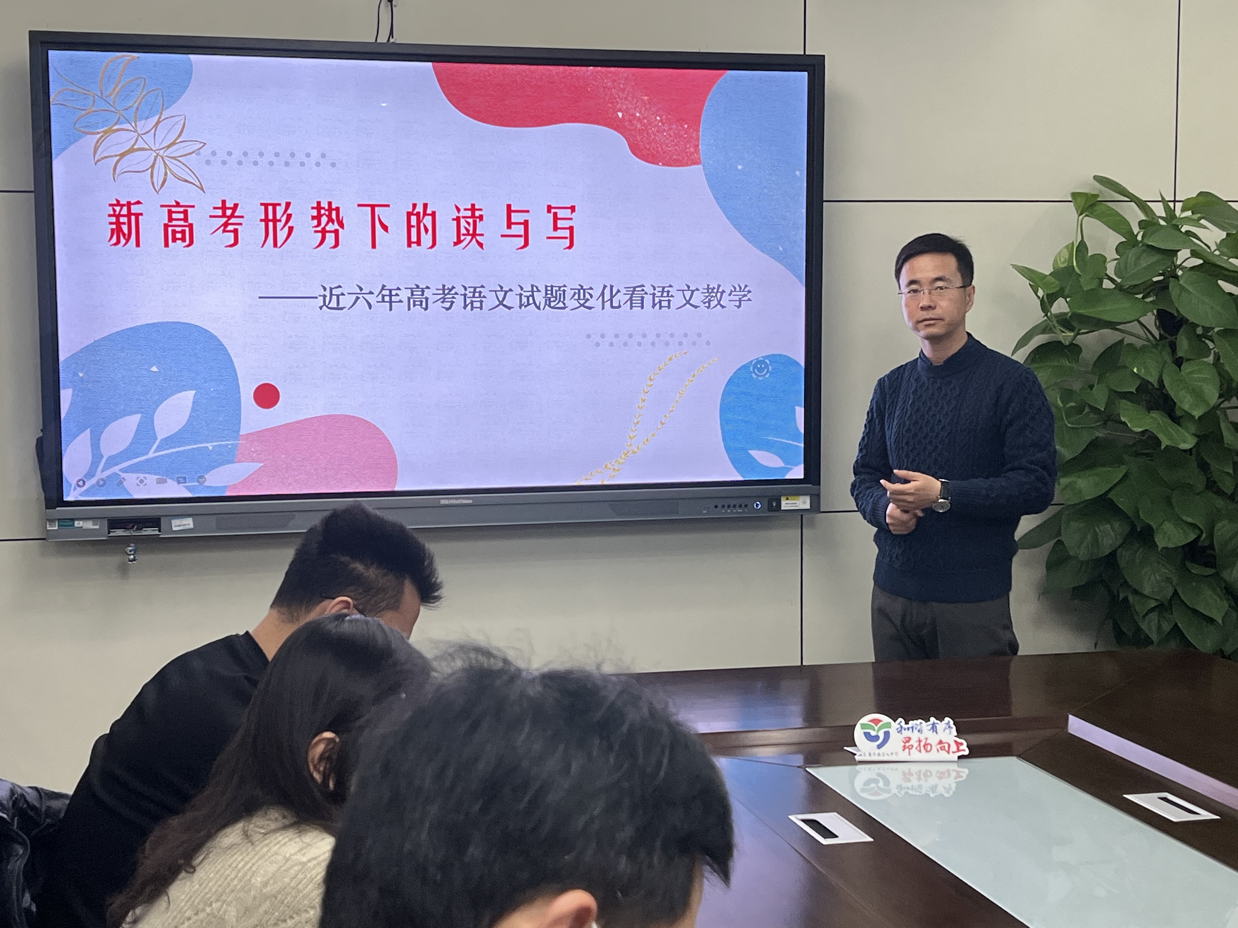 会议首先由语文教研组组长武青山老师进行以《新高考形势下的读与写》为主题的教学论坛。武老师详细分析了近六年高考语文试题的变化及试题变化背后的原因,结合对高考命题原则、命题思路与框架、真题的深入研究,阐述了对“如何在真实的语言运用情境中提升语文学科核心素养”的教学思考。