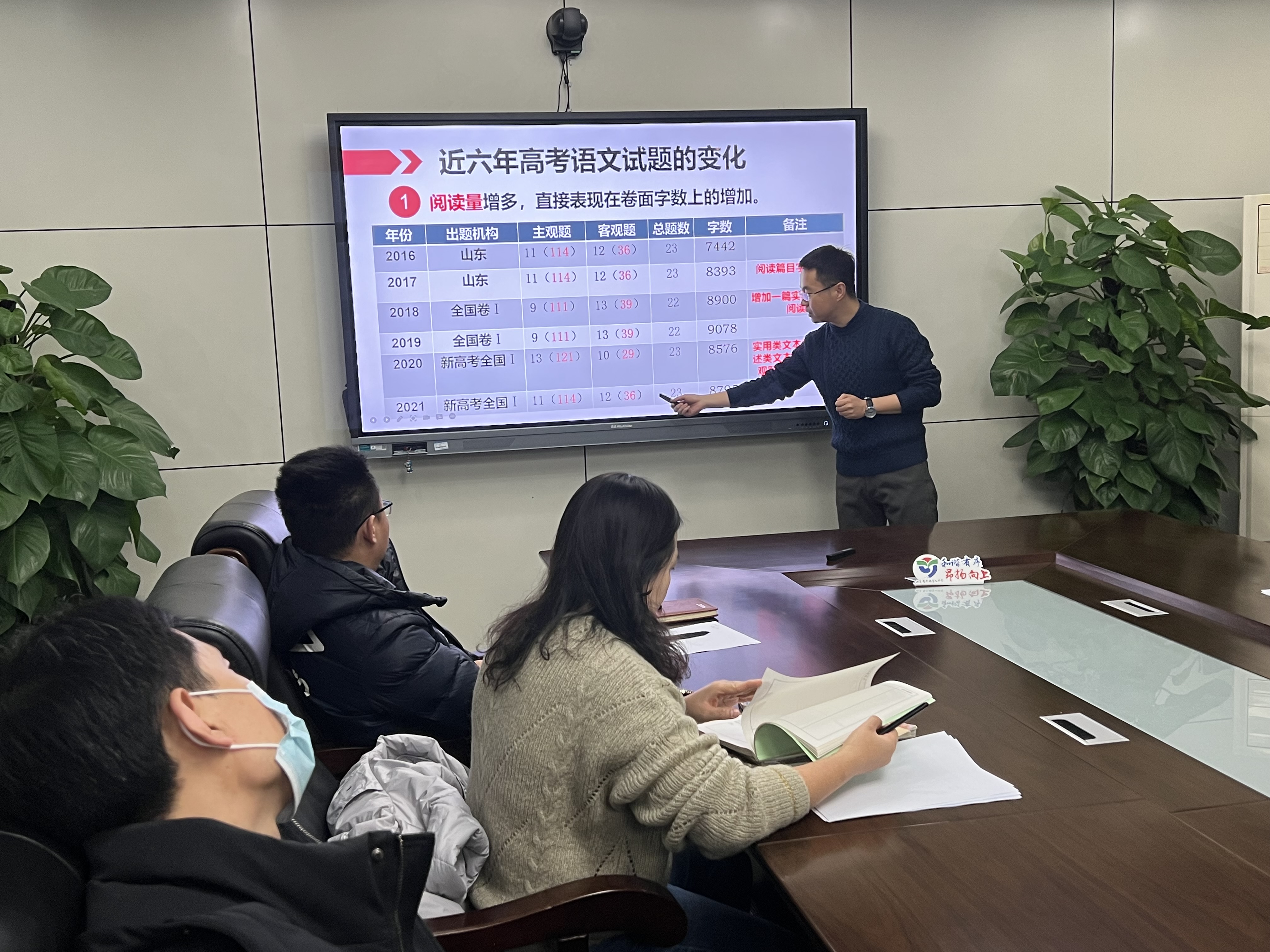 结合新教材对教学方式改革提出的要求,九中语文组教师以考定教,采用“授之以鱼,不如授之以渔”的教学策略,开展主题式“1+X”的教学,同一主题下,精读泛读结合,保证了群文阅读、主题阅读的有效性。此外,针对目前高考语文试题选文时代性和多样性的特点,语文组教师积极开展传统文化及革命文化的研读,认真筛选符合命题要求的篇目开展校本教研,教学中注重传统文化渗透,更注重民族精神及群体精神的展现,在阅读理解和鉴赏评价中引导学生学会思考、有效表达,提升语文素养。