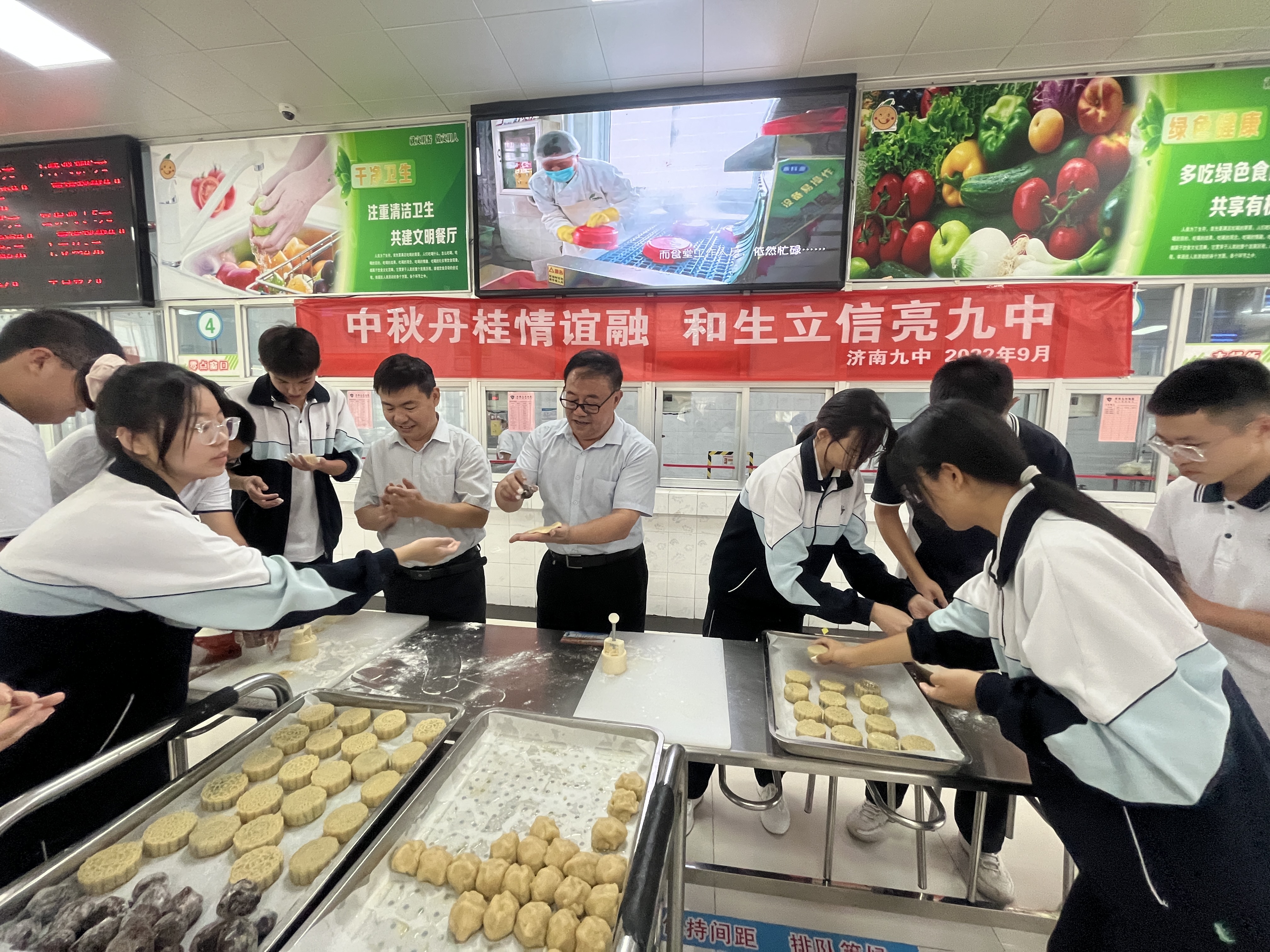在中秋来临之际,为弘扬中国传统文化,丰富校园活动,增进师生之间的感情。济南九中于2022年9月8日,开展庆中秋师生共做月饼体验活动。参加本次活动的有学校校长苗翠强、副校长程令勇、食堂及师生代表。